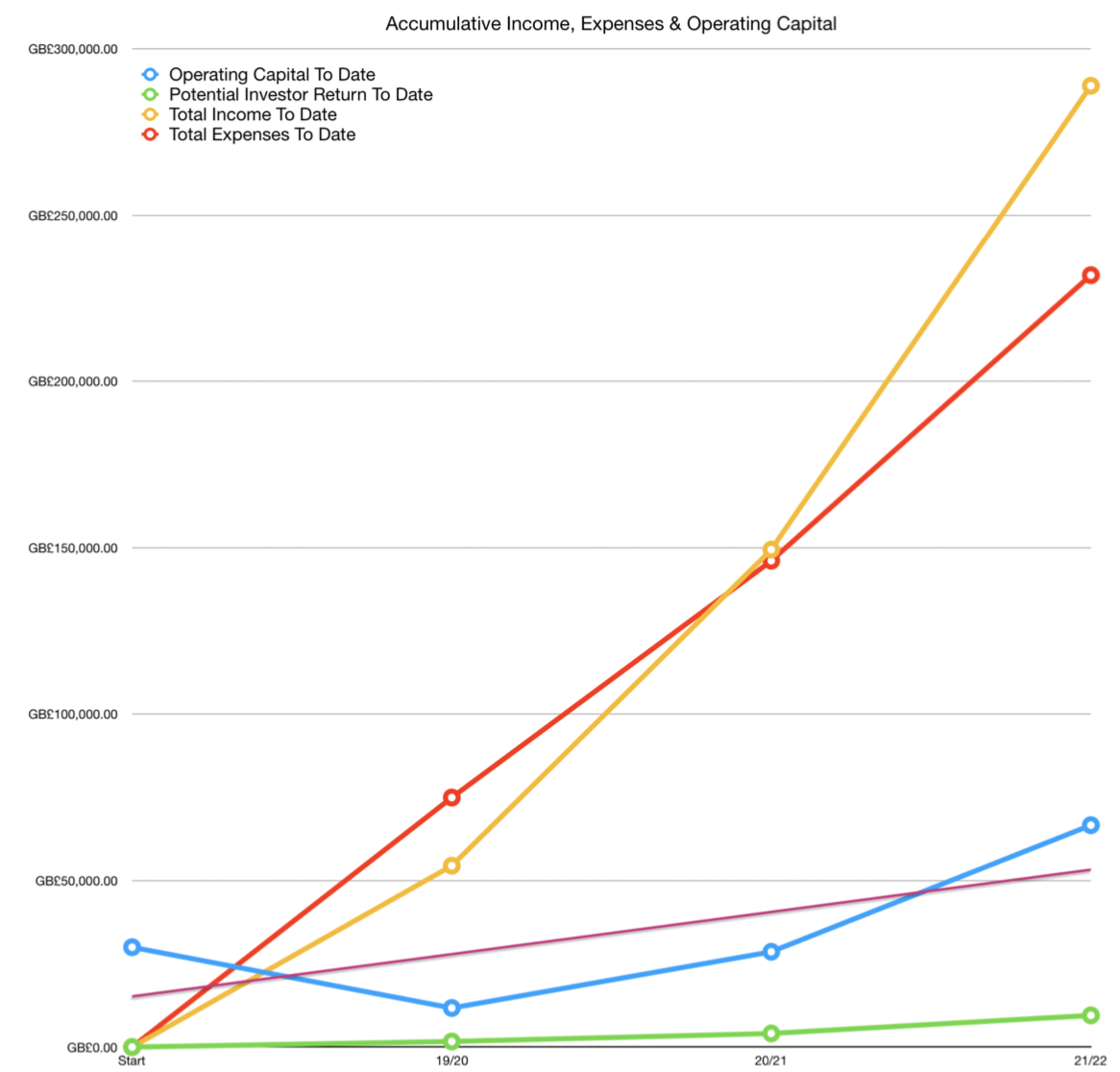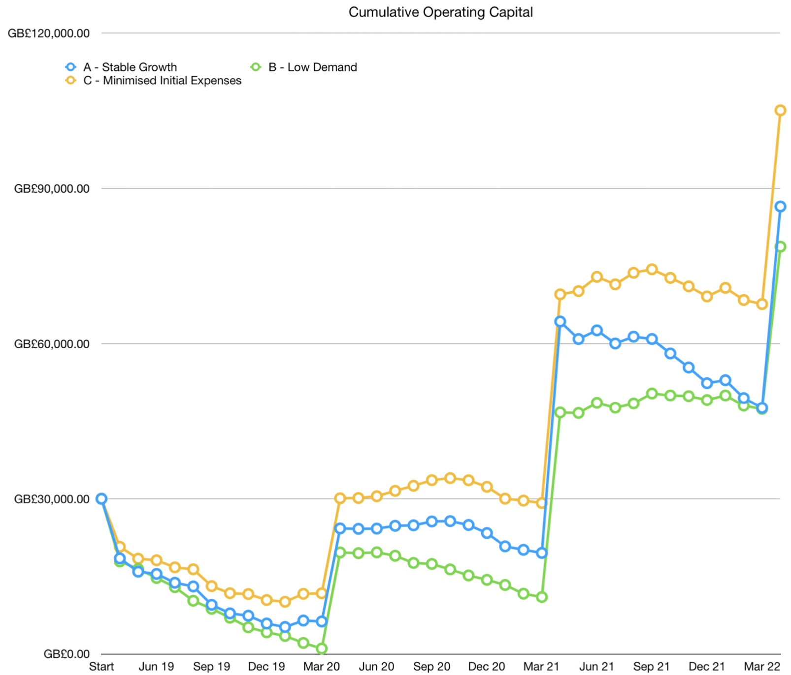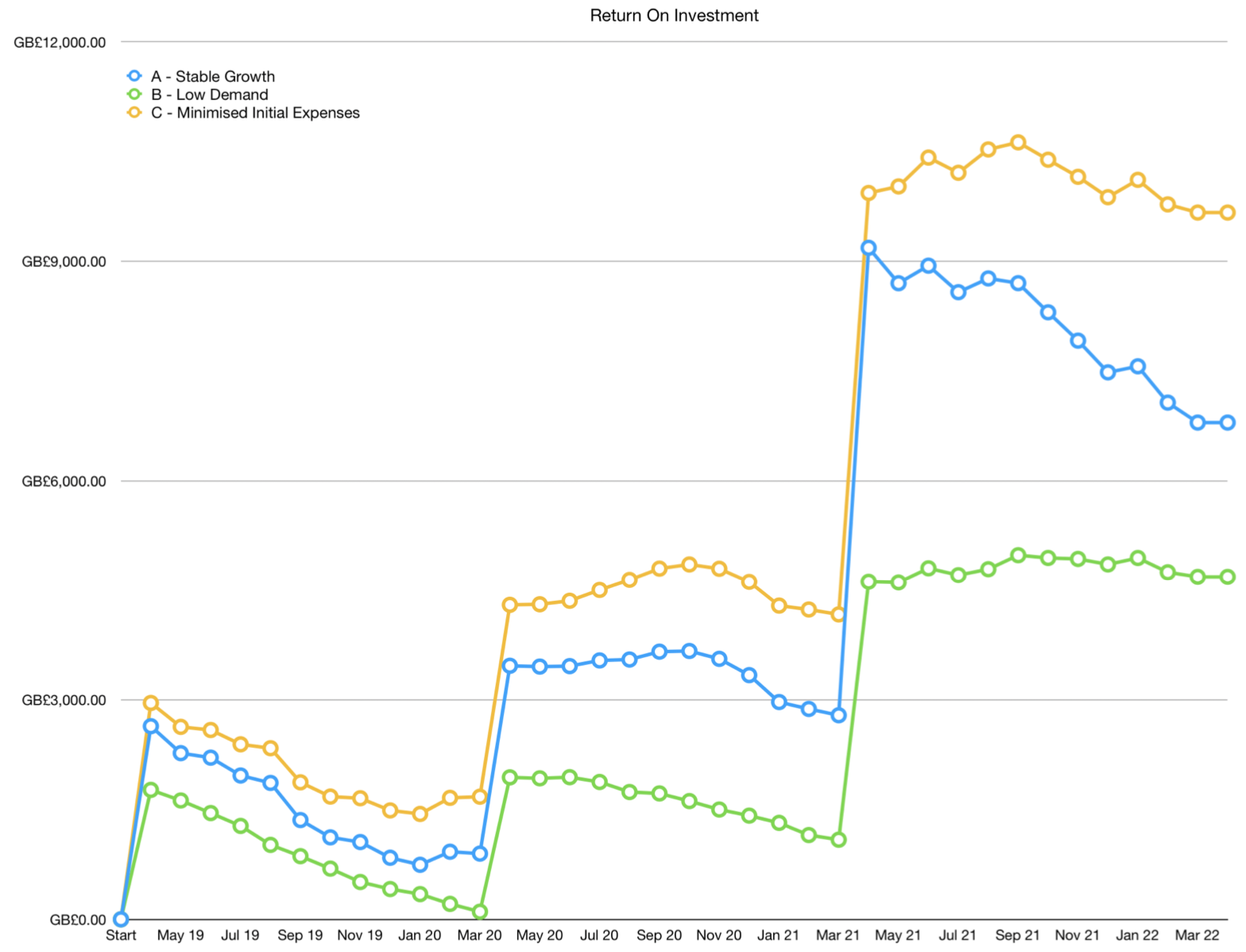 This scenario provides the lowest return rates, with the business projected to be self-sufficient towards the end of the third operational year. Figures provided in Appendix B indicate a return just over £4,515 (≈15%) on the original investment over the three year duration.