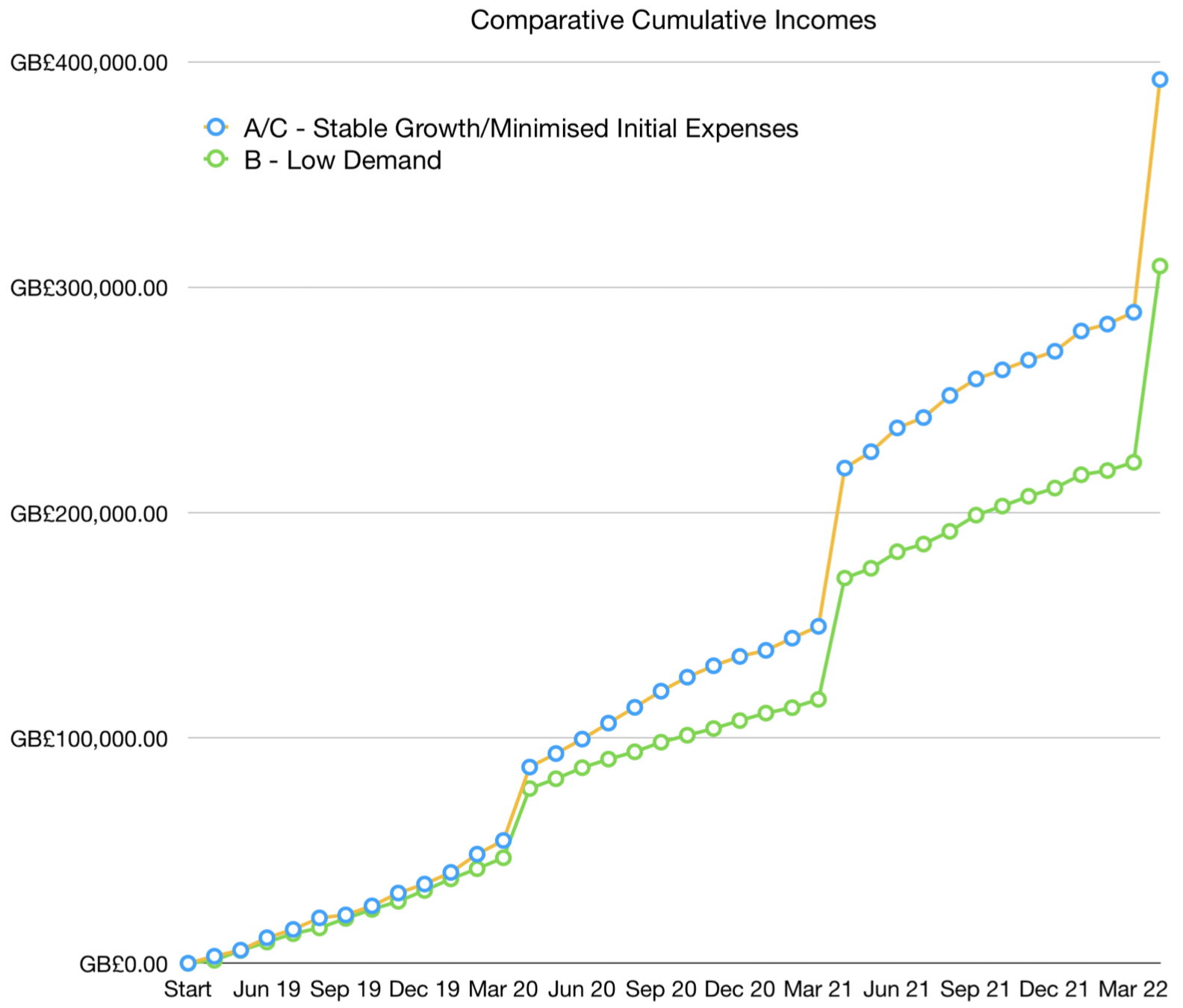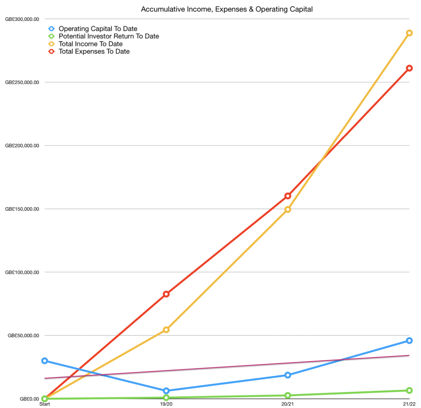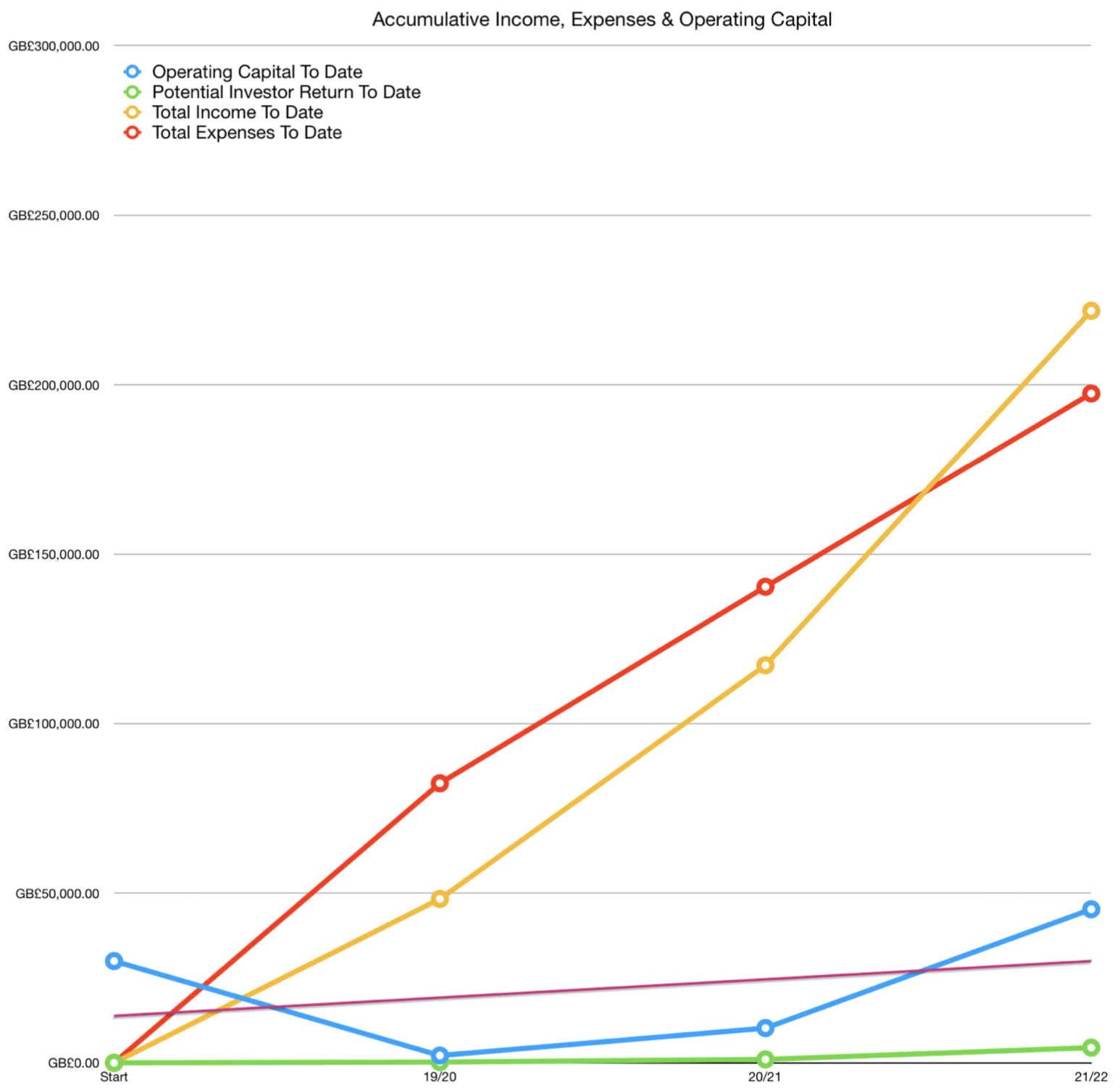 This scenario provides the lowest return rates, with the business projected to be self-sufficient towards the end of the third operational year. Figures provided in Appendix B indicate a return just over £4,515 (≈15%) on the original investment over the three year duration.