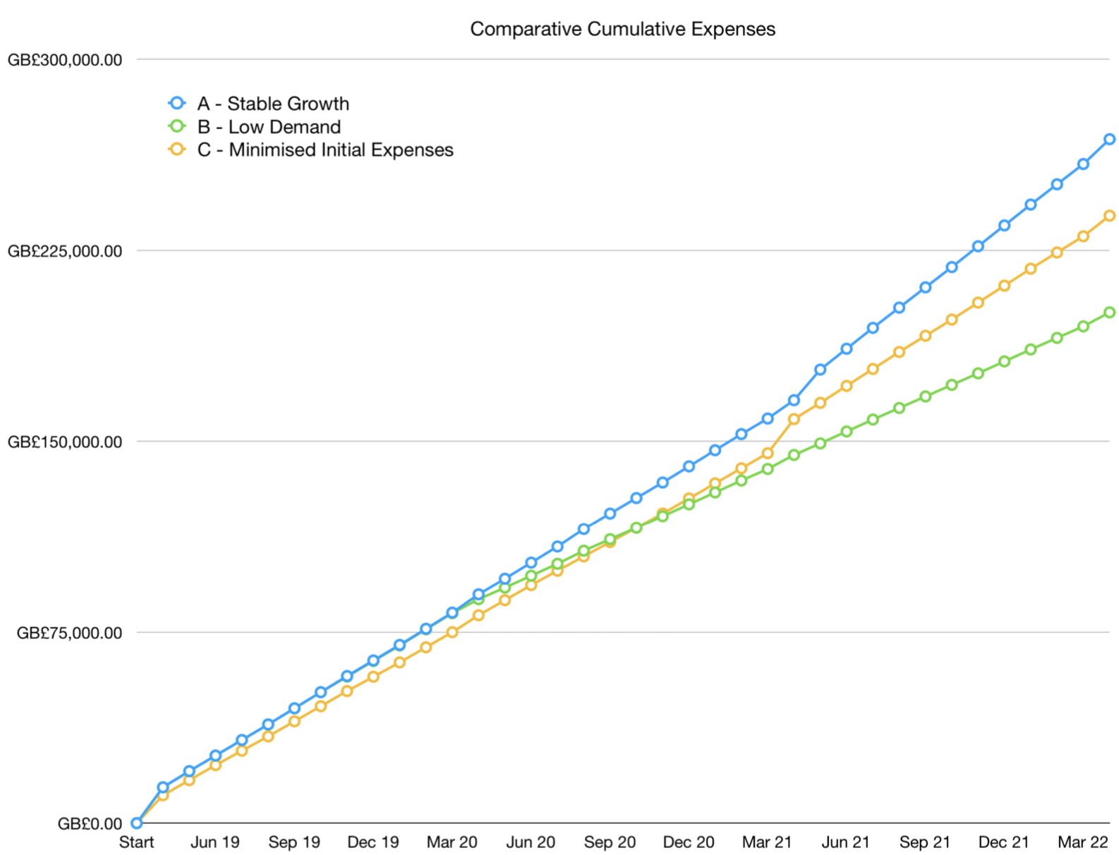 In this alternative scenario, many initial costs are postponed until sustainable profitability is achieved, with the intention of utilising advancements such as cloud infrastructure to operate the business remotely whilst maintaining all necessary workflow communications. Although traditionally this drastic approach was considered unmanageable, a carefully planned technological execution will result in the highest predicted returns, whilst leaving a reasonable monetary fallback to flexibly re-strategise with regard to operations and growth management.