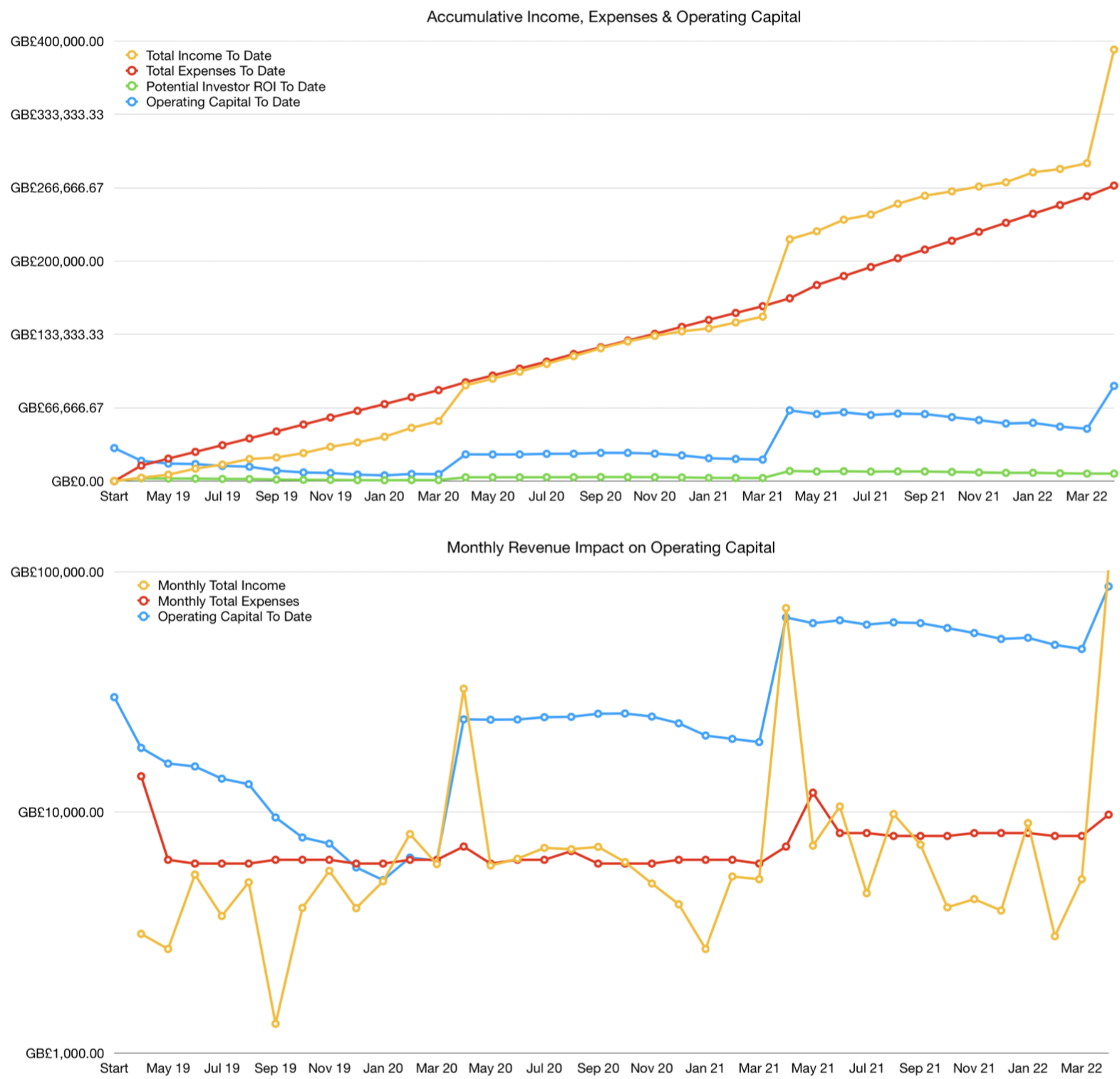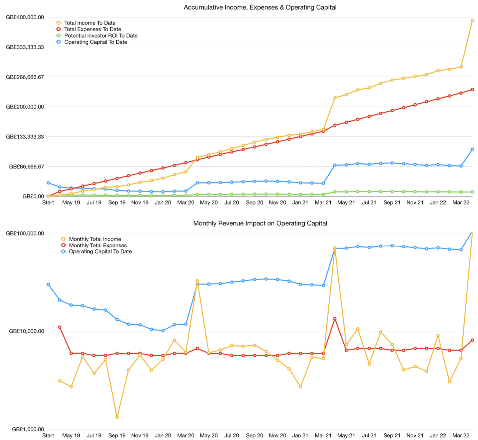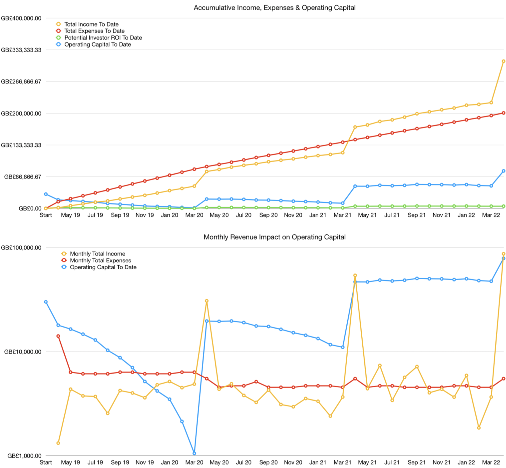 Throughout each year for the first three years, monthly operational costs are expected to border on or even outmatch revenue for most months except April, when there is expected to be a significant increase in income due to contracts. This surge in the beginning of this financial year provides opportunity to re-invest in company growth and/or provide higher return to investors. The lowest monthly operating capital is projected at approx £6,500 towards the end of the first year, providing a safety net with which to handle unforeseen circumstances or manipulate advertising budgets to increase sales turnover. Yearly Income & Expenses figures are provided under Appendix D.